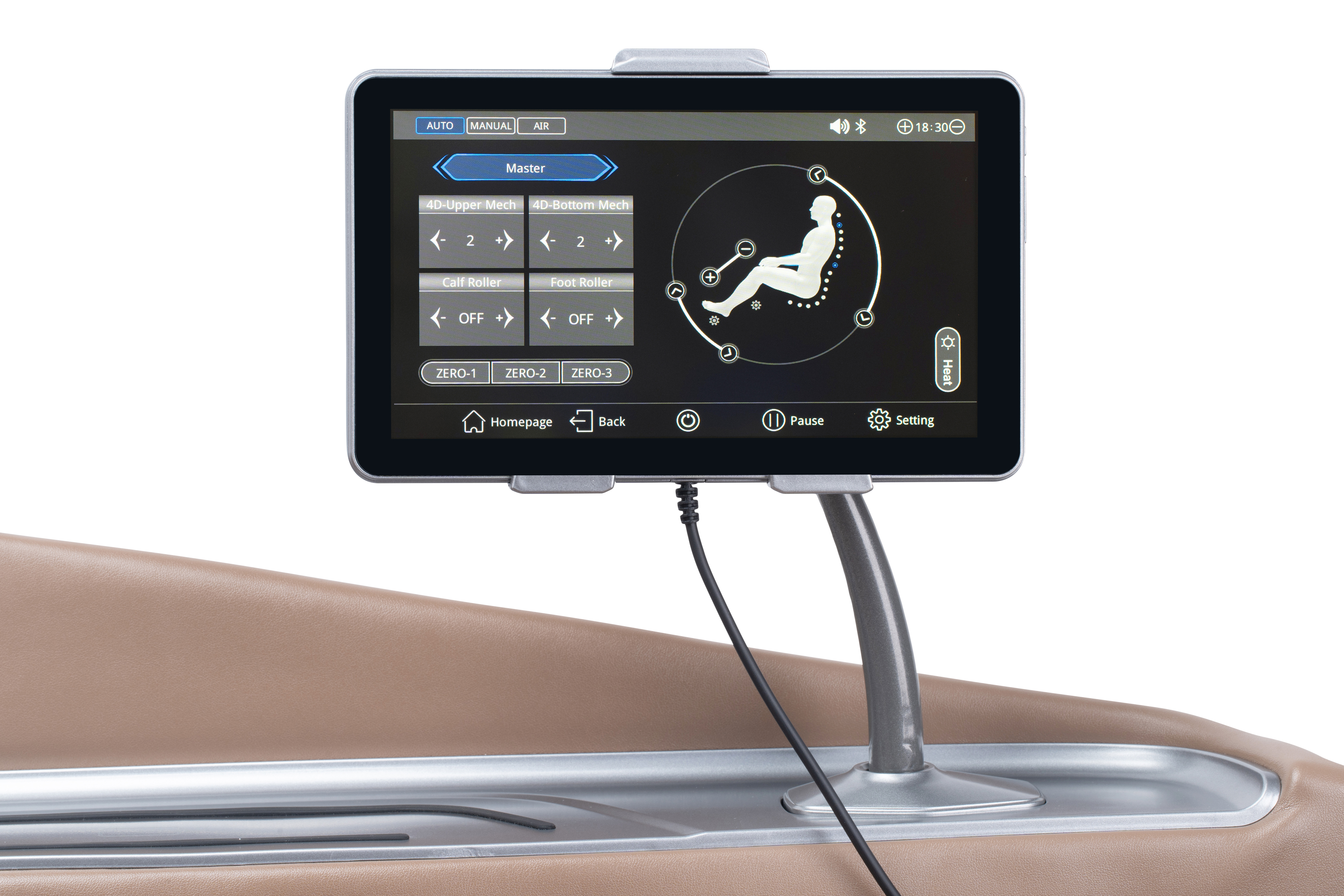 Najlepšie parametre a masáž v tejto cenovej kategórii, 12 auto programov, 6 masážnych techník, dotykové ovládanie, regulácia intenzity hlavíc a tlaku vankúšov, reflexná masáž, Zero-G, bluetooth repro, vyhrievanie
